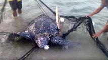 Des pêcheurs viennent en aide à une tortue géante piégée dans un filet