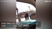 Eine Frau gibt einem Mann einen Mantel, nachdem sie ihn in der Kälte sieht.