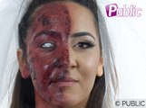 Pour Halloween, Public vous propose un tuto make-up mortel : la mariée ensanglantée.Halloween approche à grands pas... Il est donc temps de se pencher sur le déguisement idéal. Et qui dit déguisement, dit également maquillage flippant ! Nous avons donc décidé de vous montrer comment réussir un super make-up spécial Halloween : la mariée ensanglantée ! Pour réussir votre transformation, misez sur un make-up glamour pour un côté de votre visage seulement : crayon pour redessiner votre sourcil, ombre à paupière, eye-liner, un faux cil, fond de teint, blush, crayon à lèvre... Il faut en mettre plein les yeux, mais seulement d'un côté.Puis passez au côté obscure : avec un pinceau, maquillez tout votre second profil en rouge pourpre, étalez un peu de latex spécialement pour la peau... Laissez séchez puis faites des griffures en grattant légèrement avec une pince pour avoir l'effet "égratignure" escompté. Maquillez ensuite en noir l'intérieur. Enfin, ajoutez du faux sang coagulant puis liquide. Une fois votre make-up terminé, mettez une lentille de contact blanche sans pupille. Et pour les plus pointilleuses d'entre vous, prévoyez aussi une vielle robe de mariée avec accessoires (voile, gants, cape...). Effet garanti. Pour Halloween, vous serez la plus monstrueuse ! Maquillage réalisé par TessMakeUpÀ suivre sur Instagram et YoutubeModèle : Dora AouaïtiDécouvrez vite notre vidéo tuto spécial Halloween : La mariée ensanglantée et réagissez dans les commentaires. A voir aussi :Hallowe ...