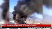 TEM'de lastiği patlayan yolcu otobüsünde yangın çıktı Alev alev yanan lastik sürücülerin yardımıyla söndürüldü Bolu'da, TEM Otoyolu'nda seyir halinde olan yolcu otobüsünün lastiğinin patlaması sonucu çıkan yangın diğer sürücülerin yardımıyla söndürüldü.