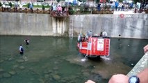 Kadın, daha sonra itfaiye aracının arkasında bulunan vinç yardımıyla evine ulaştırıldı. Haber