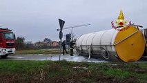 https:://www.pupia.tv - Una cisterna carica di alcol benzilico, una sostanza altamente infiammabile, si è staccata dalla motrice sulla tangenziale Ovest di Catania. Intervenuti i Vigili del fuoco per la messa in sicurezza dell’aerea e le operazioni di monitoraggio e assistenza alla ditta che ha provveduto al travaso. (25.06.22)