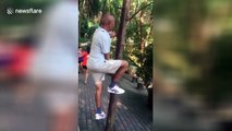 This calisthenics trainer held the bar overhead with one hand and climbed in the air. Then he did the same with the other hand, showing amazing strength. He also hung on it by the back of his neck.