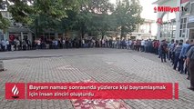 Çanakkale'nin Yenice İlçesi Akçakoyun Köyü'nde kılınan bayram namazı sonrasında cemaat köy meydanında yüzlerce yıllık geleneği tekrarlayarak insan zinciri oluşturup bayramlaştı.