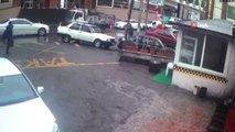 Çarpışmanın etkisiyle vidanjör kamyoneti sürüklemeye başlıyor. Kazanın ardından kamyonetin camından yola fırlayın şahıs ölümden dönüyor. O anlar saniye saniye kavşaktaki Kent Güvenliği Yönetim Sistemi kameraları tarafından kaydedildi.