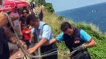 Uçurum kenarında mahsur kalan köpeği itfaiye kurtardı