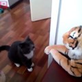 Oyuncak kaplana kafa tutan kedi