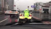 Arızalanan otomobilin yağmur altında polis tarafından itilme anı kameraya yansıdı