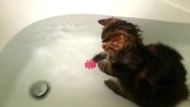 Cute kitten loves playing in the bath