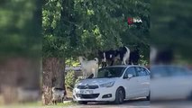 Köpeklerin saldırısından otomobilin üzerine çıkarak kurtuldu