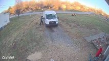 : "Fancy the chicken was in the garage roaming and an Amazon delivery guy opened the garage door for a delivery. Fancy ran out of the garage and proceeded to follow the driver as she loves human interaction. The driver then goes back and forth trying to get Fancy contained in the garage so he can close the door and leave. Fancy is staying in the garage/house because she is injured and needs to be separated from the other chickens. So she is very used to people coming in and out."