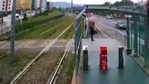 Otomobil önce vatandaşa, sonra da tramvay durağına böyle çarptı