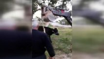 Çitlerde mahsur kalan inek iş makinesi yardımıyla kurtarıldı