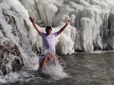 VAN'ın kış turizmine dikkat çekmek isteyen 50 kişilik grup, bu yıl 4'üncüsünü düzenledikleri 'Kış Yüzme Şenliği'nde, kısmen donan Muradiye Şelalesi'nin döküldüğü noktada buz gibi suda yüzüp, halay çekerek eğlendi.