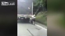 Cyclist Hitches Ride on Semi Truck on Highway