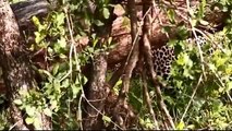 A YOUNG LEOPARD CUB WATCHING A COUPLE OF HYENAS FROM THE SAFETY OF A TREE