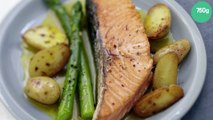 Pavé de Saumon écossais Label Rouge, poêlée de pommes ratte et asperges vertes au safran