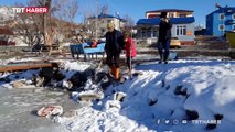 Yüzeyi donan Çıldır Gölü'nde Eskimo usulü balık avı