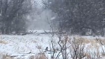 Blustery wind and snow cover the scenery