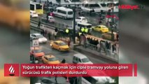 Yoğun trafikten kaçmak için ciple tramvay yoluna girdi