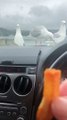 A woman was swarmed by a large group of seagulls forcing her to flee and abandon her food.