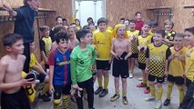 U13 et U11 reunis dans les vestiaires de lespignan pour chanter tous en coeur leurs victoires .
