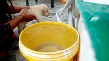 Swimming in the sea didn't come naturally to little Jeffrey, but fortunately, there was someone close by to give him a helping paw.