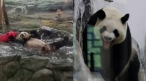 Pandas splash about to cool off in summer heat