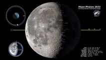 This 4K visualization shows the Moon's phase and libration at hourly intervals throughout 2022, as viewed from the Northern Hemisphere. Each frame represents one hour. In addition, this visualization shows the Moon's orbit position, sub-Earth and subsolar points, and distance from the Earth at true scale. Craters near the terminator are labeled, as are Apollo landing sites, maria, and other albedo features in sunlight.