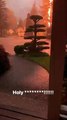 These people were standing on the patio to watch the storm, when lightning hit with a loud bang, frightening them. They all went into the safety of their home.