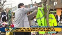 SJL: Vendedores ambulantes toman calles de avenida y cuelgan sus productos en arboles de berma central