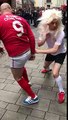 Lads dressed as Bobby Charlton and Rudi Voller play football in street