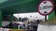 Caminhão enrosca no viaduto e provoca congestionamento no Trevo do Guarujá