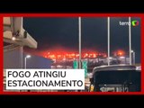 Todos os voos para o aeroporto londrino de Luton foram suspensos nesta quarta-feira após um incêndio. O fogo causou o colapso parcial de um estacionamento no local e teria danificado 1.200 veículos. imagens Henry NICHOLLS / AFPTV / Bedfordshire Fire and Rescue Service / AFP