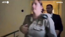 Roma, 13 ott. (askanews) - Il presidente israeliano Isaac Herzog, la presidente della Commissione europea Ursula von der Leyen e la presidente del Parlamento europeo, Roberta Metsola, si dirigono verso un rifugio mentre risuonano le sirene di allarme a Tel Aviv. Le immagini sono state fornite dalla presidenza israeliana.Von der Leyen e Metsola sono arrivate in Israele "per esprime solidarietà nel contesto del terribile attacco terroristico da parte di Hamas".