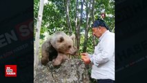 Ağzıyla ayıya şeker yediren vatandaşın ilginç görüntüsü