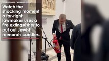 Polish MP Grzegorz Braun extinguishes Jewish Hanukkah candles at Poland's parliament.