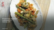 Hoy te presentamos un revuelto gourmet, con espárragos verdes, setas de temporada, tomillo y jamón de pato. Se cuaja todo con el huevo a fuego suave.