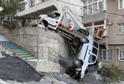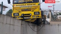 Kocaeli'nin İzmit ilçesinde rampadan inerken sürücüsünün kontrolünü yitirdiği hafriyat kamyonu, bir binanın istinat duvarının üzerinde asılı kaldı. Kamyon şoförü, kazayı yara almadan atlattı.