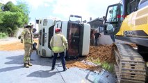 Hafriyat kamyonu devrildi: Şoför kabinde sıkıştı