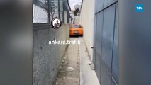 Ankara'nın Etimesgut ilçesinde gece saatlerinde alkollü olduğu için polisten kaçan taksi şoförü Y.K.'nın aracı iki duvar arasına sıkıştı. Sürücü Y.K., polisler tarafından aracın yan camından dışarı çıkarılıp yakalandı. Olay güvenlik kamerasına yansırken, araç sıkıştığı yerden çekiciyle çıkarıldı.