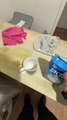 A woman was getting ready to have a quick cup of coffee at her home in Atlanta. She picked up a bottle of almond milk to add some to her coffee without realizing that the lid wasn't secured in place. As she began shaking the bottle, its contents flew out and got everywhere, leaving the woman bewildered.
