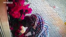 Bir kişinin suni çiçeği koparmaya çalışırken oteli yaktığı anlar kamerada