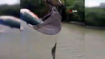 Avladığı 25 kilogramlık sazan balığını sudan kepçe yardımıyla çıkartabildi