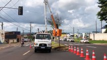 Equipe trabalha na substituição de semáforo que foi derrubado na Avenida Rocha Pombo