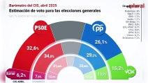 El Barómetro de Opinión del Centro de Investigaciones Sociológicas (CIS) correspondiente al mes de junio sitúa de nuevo en cabeza al PSOE, con un 32,9% de estimación de voto y aumentando hasta los 2,7 puntos su ventaja sobre el PP, al que calcula un apoyo del 30,2%, medio punto menos que en junio. (Fuente: Europa press / Congreso /Sumar / PSC /PSOE)