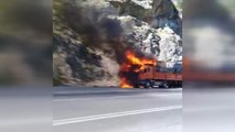 Yangın sonucu tır tamamen yanarak demir yığınına döndü
