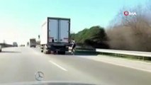 İSTANBUL-BAĞCILAR'DA KAMYONUNUN ARKASINDAKİ BİSİKLETLİNİN TEHLİKELİ YOLCULUĞU
