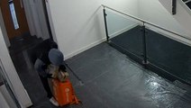 This is the odd moment police officers arrest a man dressed as a dinosaur after he was spotted stealing packages.