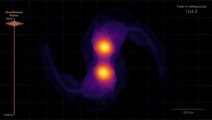 See a pair of superheavy neutron stars collide in this simulation with gravitational wave audio. "An audible tone and a visual frequency scale (at left) track the steady rise in the frequency of gravitational waves as the neutron stars close," according to NASA's Goddard Spaceflight Center.
